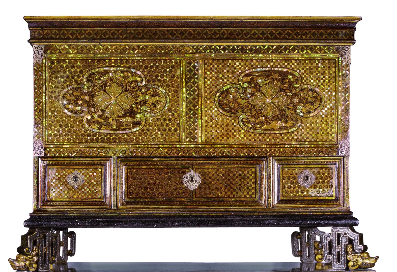 Arca lacada de formato paralelepipédico com tampo liso removível, frente e bandas laterais em goma-laca preenchida com incrustações de madrepérola, suportada por quatro pés em forma de dragão chinês. A face frontal é compartimentada em cinco seções de formato rectangular decorados com motivos fitomórficos. No nivel superior destacam-se duas reselvas em decoradas com mtivos vegetalistas em falsa simetria. A zona inferior é secionada em três gavetas com ferragens de latão arrendadas.