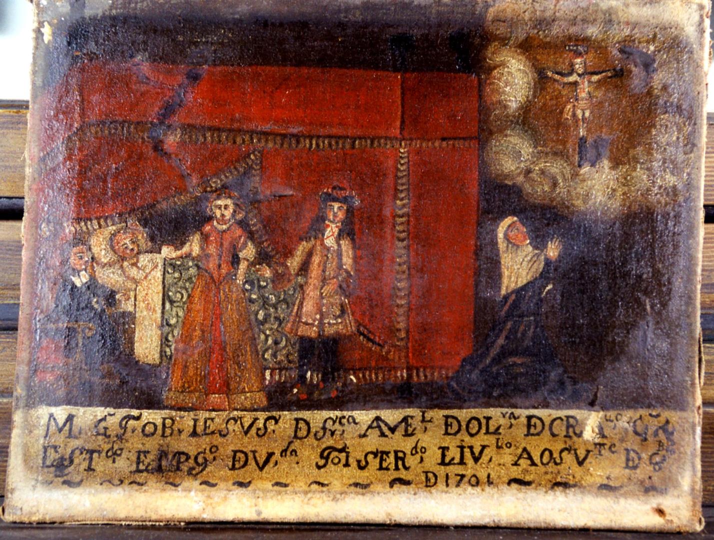 Um homem vestido de branco encontra-se deitado dentro de uma cama de docel vermelho, em que uma das cortinas está afastada para a deixar ver. Junto à sua cabeceira, encontra-se um médico sentado, vestido de preto. Em pé, um casal ricamente vestido. Ele de chapeu, casaca e espada. Ela de vestido com corpete e colares. Ela dá um remédio ao homem doente. Afastada do grupo, uma outra mulher, idosa, de cabeça coberta, encontra-se ajoelhada rezando para o céu, onde parace por entre uma glória de nuvens e luz, um crucifixo com Jesus Cristo crucificado. Uma inscrição na base do quadro explica cena e os motivos que levaram à sua concepção.